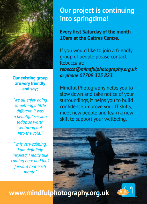 We are developing our work in bringing Mindful Photography sessions to work places. Our recent work at IDAS was really well received and we have since had enquiries to develop these sessions with our other large organisations. If your staff would welcome even as little as 90 minutes out their working week to experience a Mindful Photography session drop us an email at rebecca@mindfulphotography.org.uk